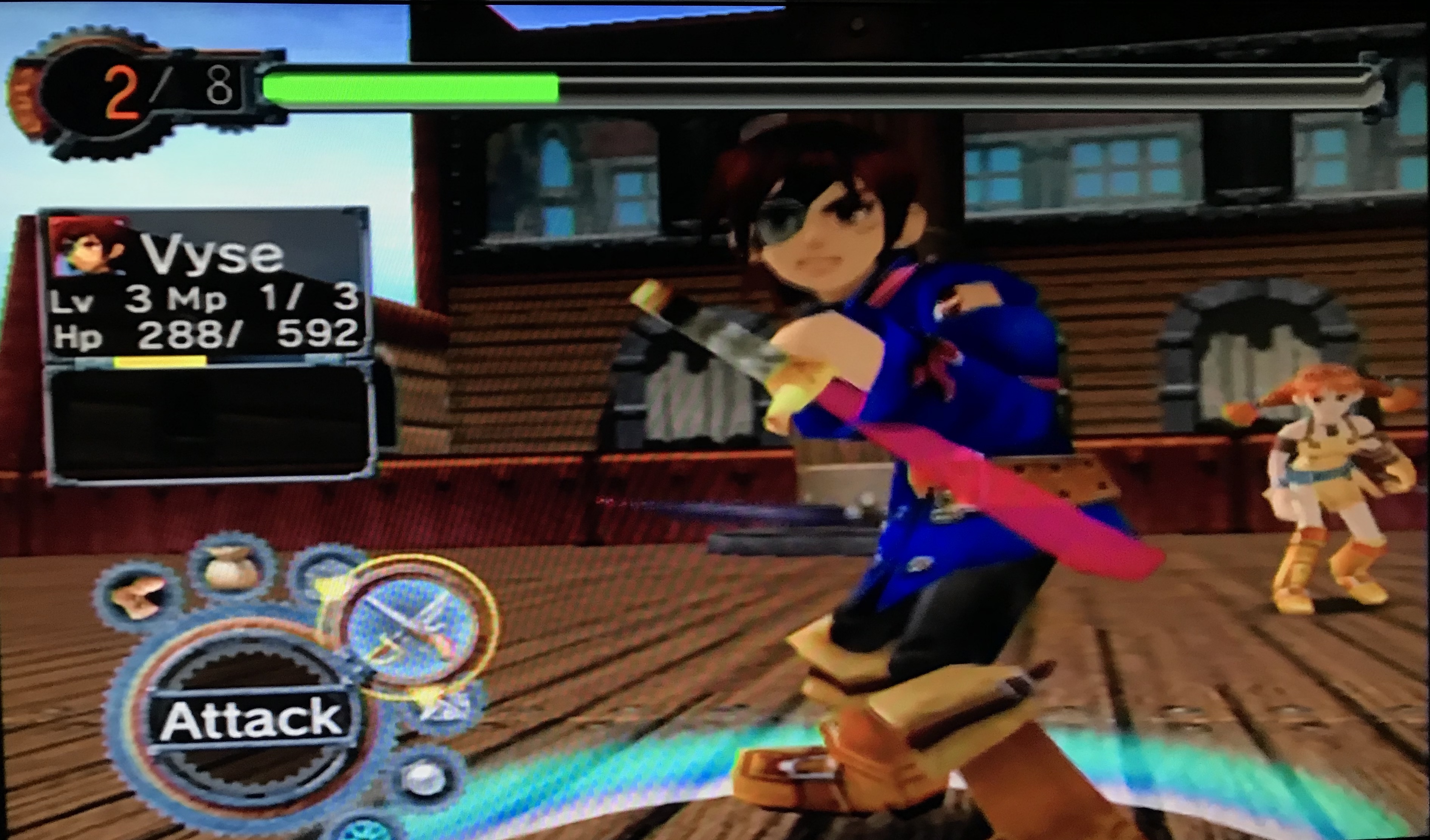 Even though it’s a GameCube game, it visually looks like a classic Dreamcast game. While the textures are only okay in today’s standards, but I was taken back to my childhood looking at the game in action. As the game’s main characters, I really like Vyse and Aika. While Aika is the bubbly sidekick, Vyse is a high energy pirate that reminds me of Robin Hood. For some reason, I thought Vyse was going to be more edgy and reserved since he was a pirate, which is why his actual personality is great. There are two different types of pirates in the game’s world: The Blue Rogues and the Black Pirates. The Blue Rogues, the group that Vyse and Aika are affiliated with, are pirates with good intentions, since they steal from the rich to help out the poor. The Black Pirates, on the other hand, are your typical pirates that steal from anyone for themselves.