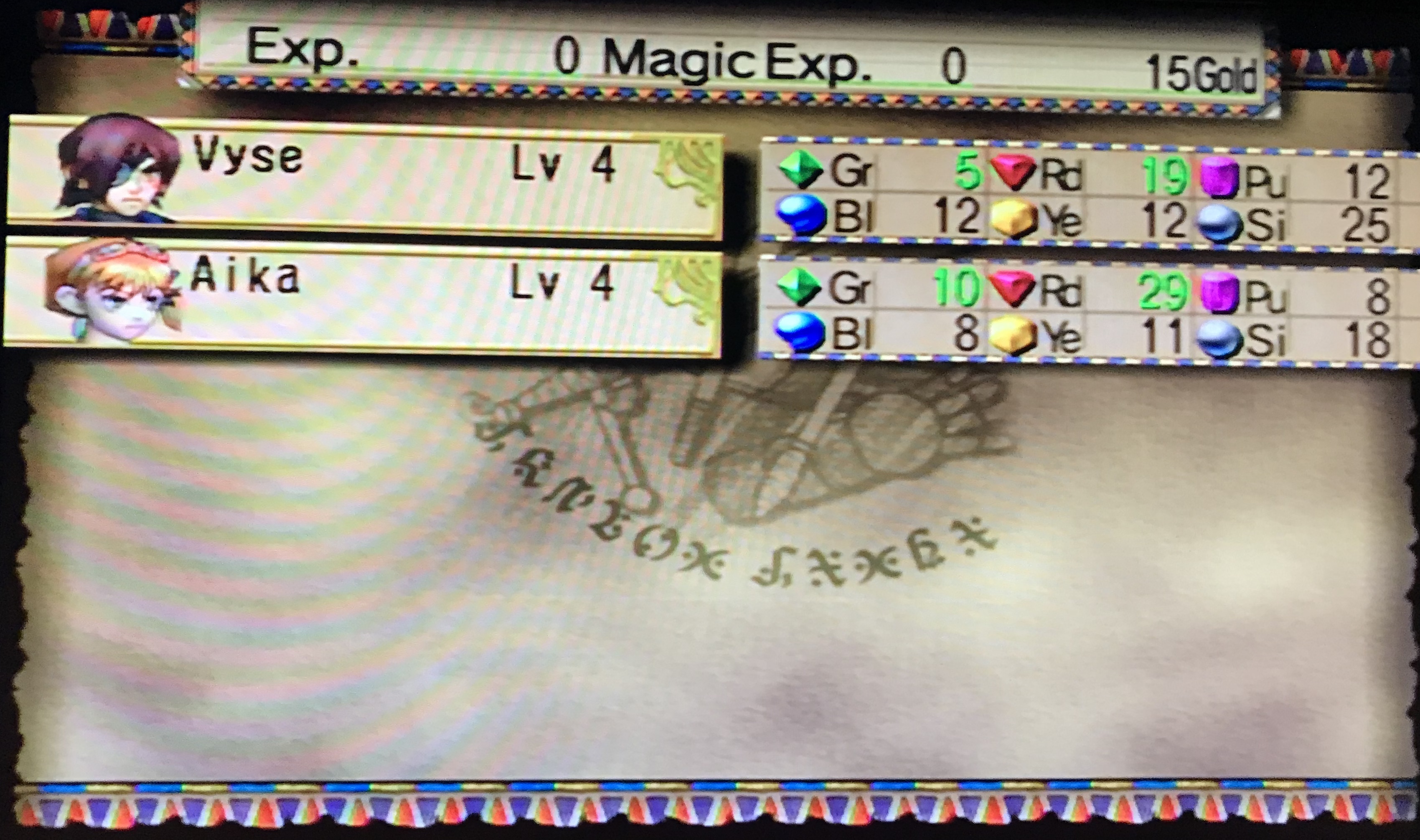 As a turned based RPG, this game does enough different to feel unique and fun. When your party and the enemies attack, they move around the battle area with some attacks change depending where you character is. For example, Aika uses a boomerang that she throws if the enemy is far away but uses it as a blunt object if the enemy is close to her. Magic and Special Attacks use the SP gauge, which is shared with the party and also increases per action. The interesting thing about that is that magic only uses 1 MP in addition to SP, which is different from other RPGs, where magic uses more MP. You learn magic by gaining Magic Exp, which is gained by attacking with your weapon. Depending on the color of the weapon (which you can change during battle), you gain experience for that color. For example, if you attack with a magenta weapon with Vyse, you gain experience for magenta magic. Once you get enough experience with magenta, you learn a fire magic attack.
