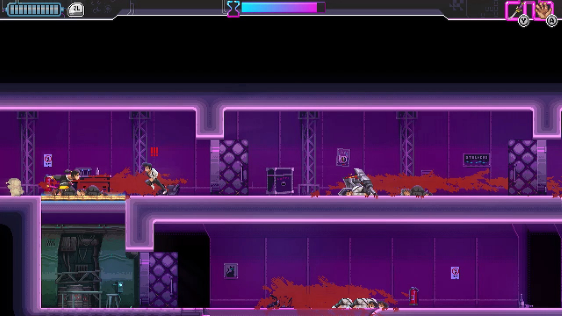 I really like the 80’s neon-noir style the game is going for with both its music and its visuals. Each stage plays out as if your character is planning how he is going to get through the room, and after you beat the section you get to see a recording of you going through the room in real time. The game gets visually trippy with some cool visual effects. Sometimes when you play in a later stage, the screen is like a video that skips and rewinds on its own, which reminded me of a horror game. This is probably representing the drug your character is injected with before each stage wearing off.