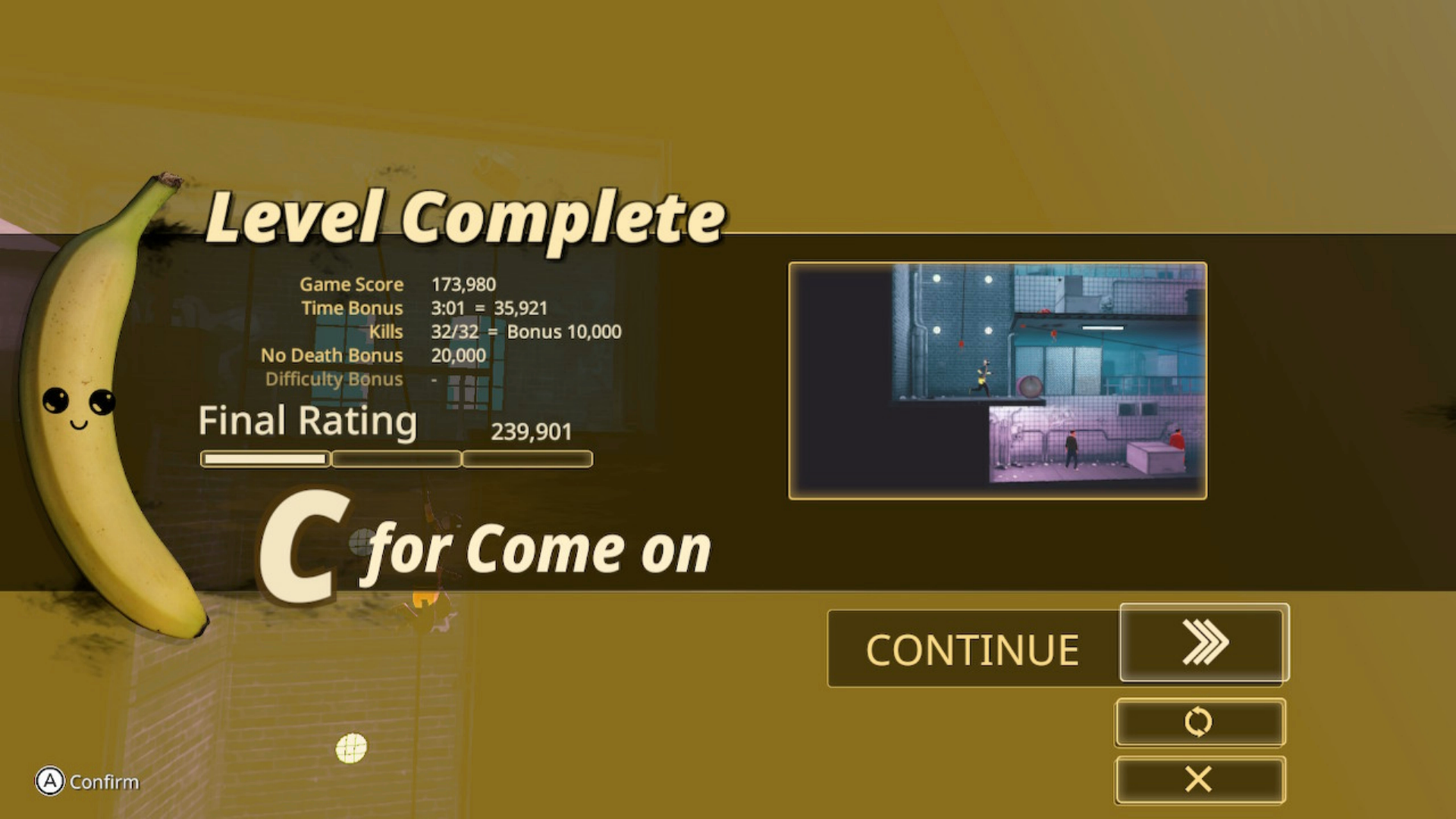 The game has an interesting ranking system, where style points and the kill multiplier are important to get a good rank. Throughout the first section of the game, I always got a C ranking in every stage. However, getting low ranks in games like this don’t really bother me, since it doesn’t have a big impact on the overall game. Right now, I would recommend anyone to play My Friend Pedro even though I haven’t played through the whole game.