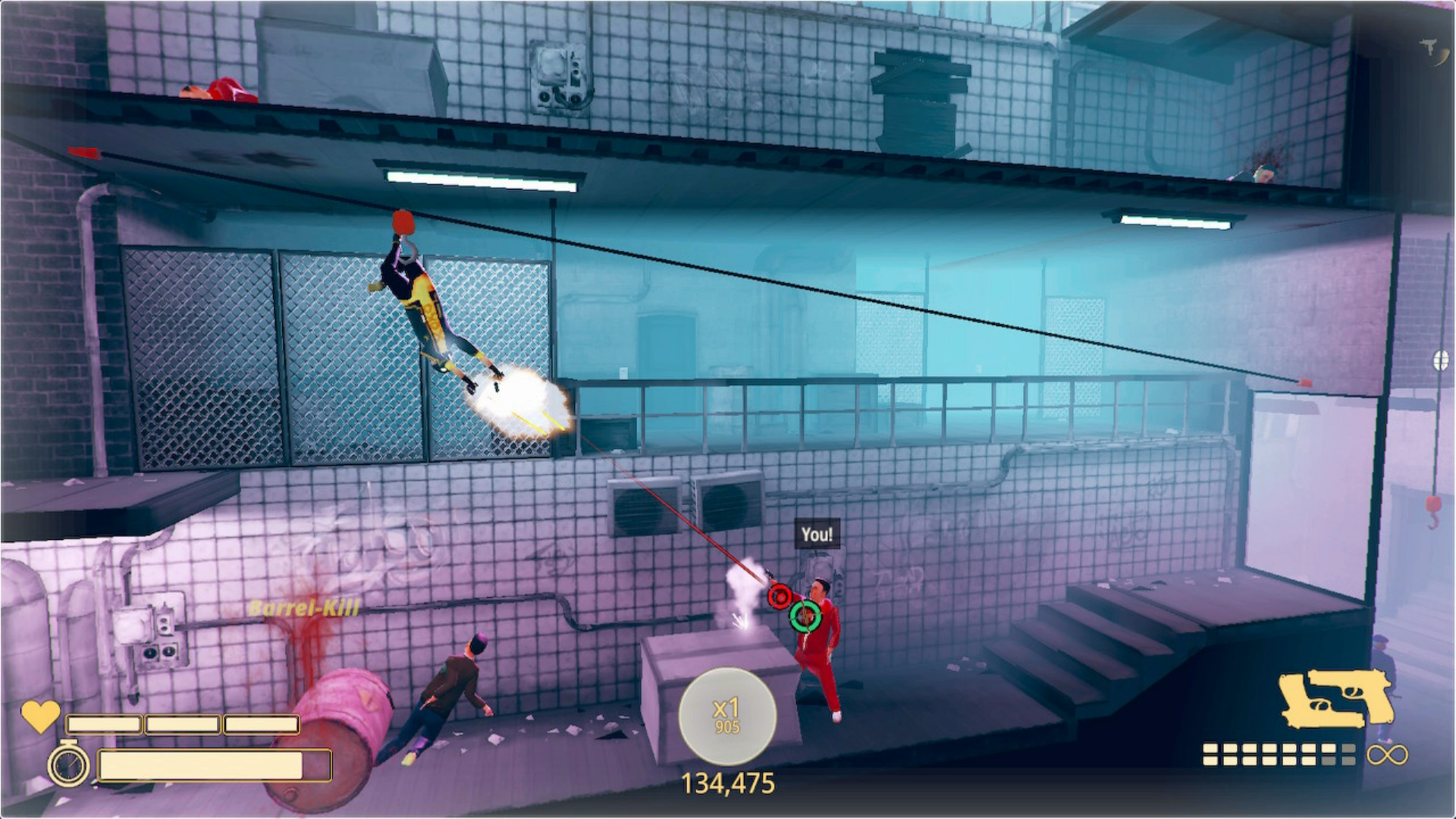 One of my worries was that the game would feel repetitive: enter the room, kill enemies, proceed to the end. However, that is not the case. Each level of the game would introduce a new way to take out enemies, like shooting a frying pan in mid air and deflects the bullets towards enemies or throwing a basketball at one. I was also surprised of the game’s stage design, as there are good platforming puzzles in the game’s levels.